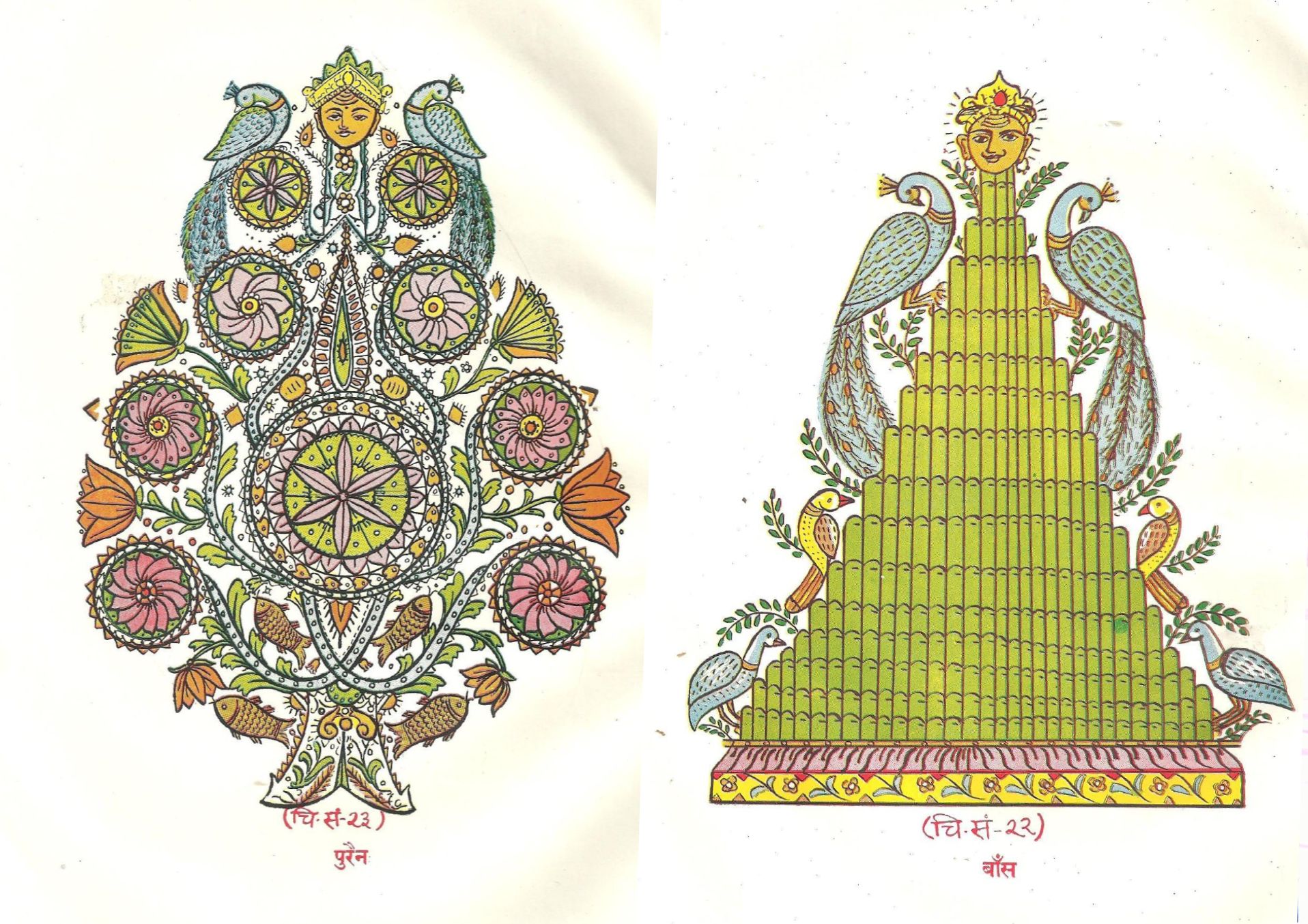 कोबर में जिन आकृतियों पर सबसे पहले नजर जाती है, वह है पुरैन और बांस। कोबर की दक्षिणी दीवार पर पुरैन और बांस का चित्रण विधि सम्मत है। बांस पर ही लटपटिया सुग्गे और मोर का चित्रण किया जाता है। लटपटिया सुग्गे को प्रेमी युगल का प्रतीक माना जाता है। उनके साथ बांस का चित्रण नव-दंपत्ति के कुल या वंश की वृद्धि एवं उनके दीर्घायु होने की मंगलकामना का द्योतक है। ज्ञात है कि बांस, ग्रामिनीई (Gramineae) कुल का एक बहुपयोगी घास है। वह सबसे तेज बढ़ने वाले पौधों में शामिल है। उस पर कीटों का प्रभाव नहीं पड़ता है। वह सूखा या अत्यधिक वर्षा में भी अप्रभावित रहता है। बांस में फूल शुष्क परिस्थितियों में ही खिलते हैं। उसकी इन्हीं क्षमताओं-विशेषताओं को ध्यान में रखते हुए कोबर में उसे स्थान दिया गया है। नवदंपति को यह सीख दी गयी है कि गृहस्थ जीवन की विपरीत परिस्थितियों में भी आपसी संबंधों में प्रेम-पुष्प खिलाये रखना चाहिए।