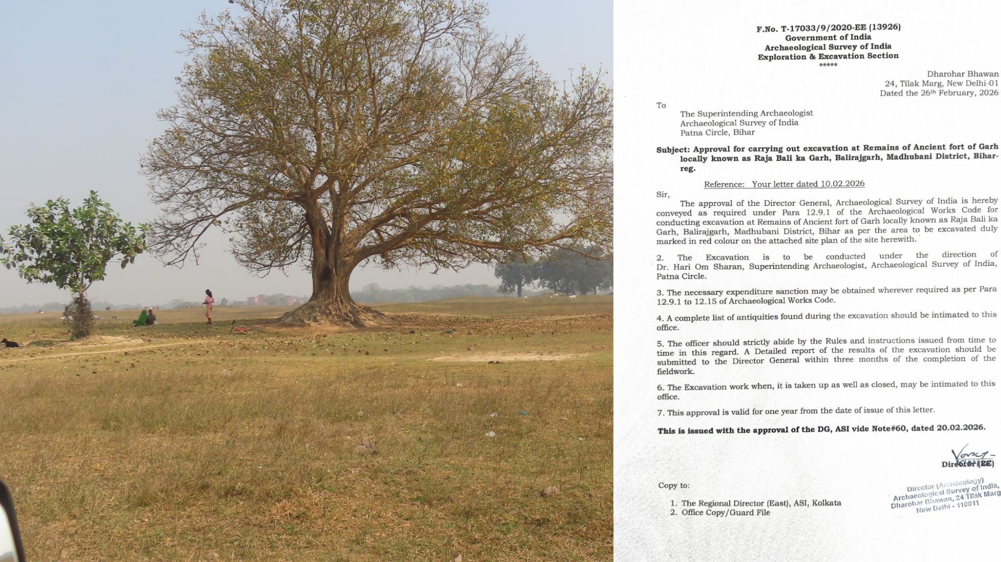 पत्र में लिखा गया: “आर्कियोलॉजिकल वर्क्स कोड के पैरा 12.9.1 के तहत, भारतीय पुरातत्व सर्वेक्षण के महानिदेशक की मंज़ूरी दी जाती है। यह मंजूरी बिहार के मधुबनी ज़िले के बलिराजगढ़ में राजा बलि का गढ़ नाम से मशहूर पुराने किले के अवशेषों पर खुदाई करने के लिए है। खुदाई की जाने वाली जगह को साथ में दिए गए साइट प्लान पर लाल रंग से मार्क किया गया है।