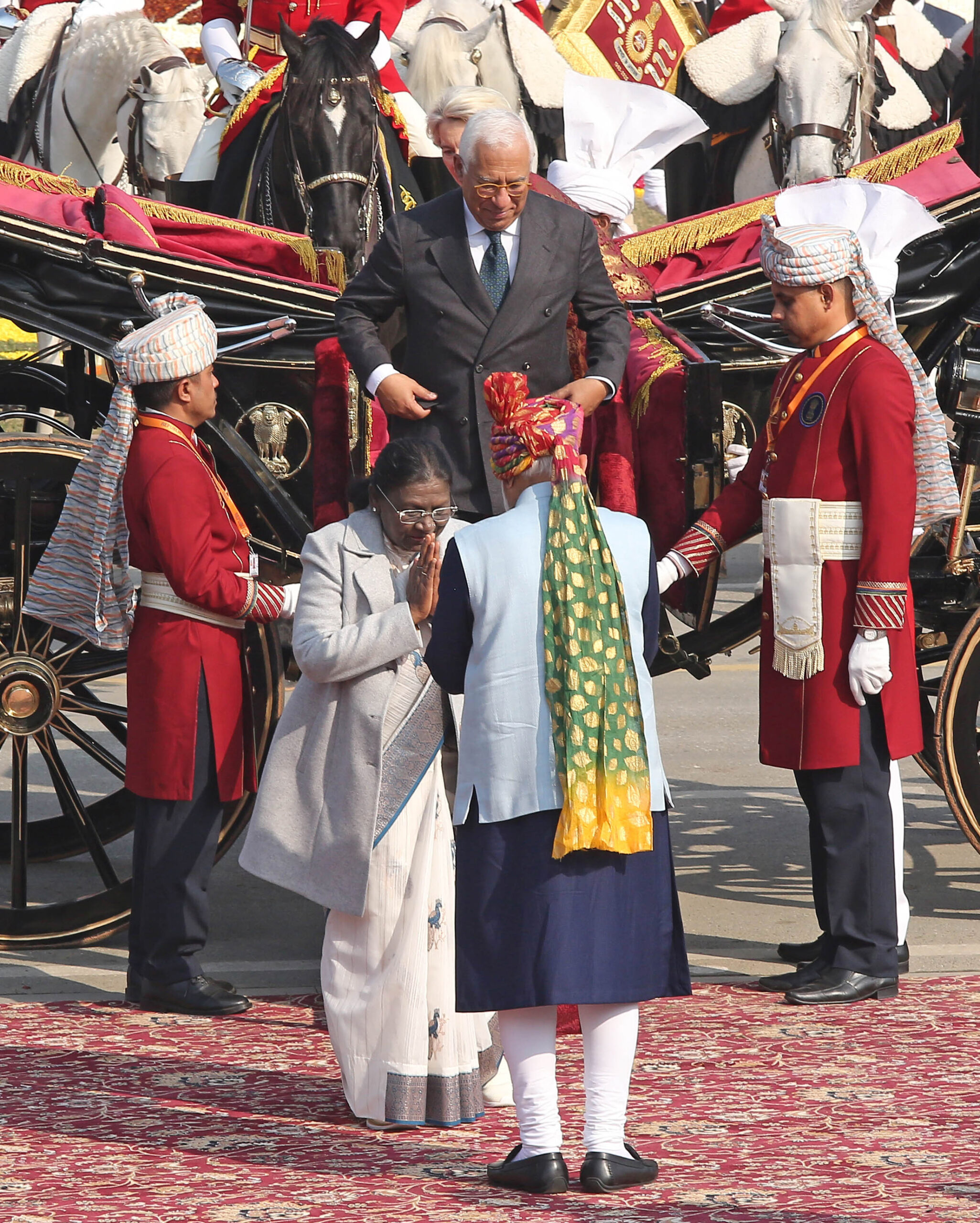 बाहर, किंग्सवे पर भीड़ लगी हुई थी, जो राष्ट्रपति को सोने की परत वाली, घोड़ों से खींची जाने वाली शाही बग्घी में, घुड़सवार अंगरक्षकों के साथ बाहर निकलते देखने का इंतजार कर रही थी। सोने की परत वाली, छह घोड़ों वाली बग्घी, जिसमें लाल मखमल का इंटीरियर और उभरा हुआ अशोक चक्र लगा था। भारत के गणतंत्र दिवस के सबसे स्थायी प्रतीकों में से एक रही है। यह मूल रूप से, यह ब्रिटिश शासन के दौरान भारत के वायसराय की थी और वायसराय की संपत्ति के आसपास औपचारिक उद्देश्यों के लिए इस्तेमाल की जाती थी। 1950 में भारत के पहले गणतंत्र दिवस पर, डॉ. राजेंद्र प्रसाद इस बग्घी में राष्ट्रपति भवन से इरविन एम्फीथिएटर तक गए थे, उनके साथ घुड़सवार बॉडीगार्ड थे, जो औपनिवेशिक सत्ता से भारतीय नेतृत्व में बदलाव का प्रतीक था।