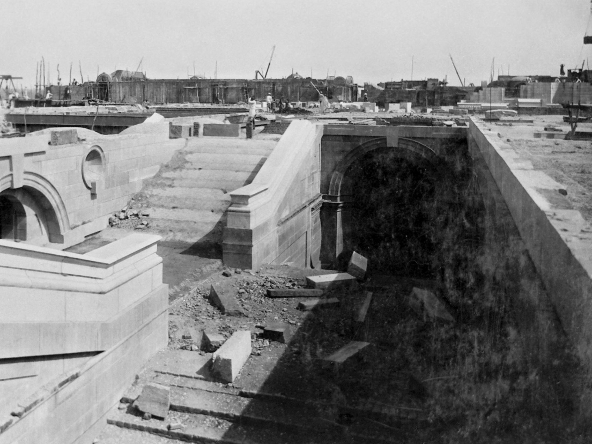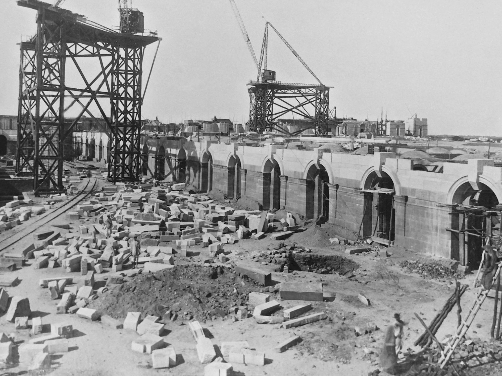 इतिहासकार कहते हैं कि इसके निर्माण के समय चुने गए स्थान की चट्टानी पहाडि़यों को विस्फोट से तोड़ा गया तथा वायसराय के आवास और अन्य कार्यालयी भवनों के निर्माण के लिए भूमि समतल की गई। इस स्थान पर शिलाओं ने मजबूत नींव के रूप में अतिरिक्त फायदा पहुंचाया। निर्माण सामग्री के लाने ले जाने के लिए इमारतों के चारों ओर विशेष तौर पर एक रेलवे लाइन बिछाई गई। चूंकि नगर की योजना नदी से दूर बनाई गई थी और दक्षिण में कोई नदी नहीं बहती थी इसलिए पानी की सभी जरूरतों के लिए जमीन के भीतर से पम्प द्वारा पानी निकाला गया। इस क्षेत्र की अधिकतर भूमि जयपुर के महाराजा की थी।