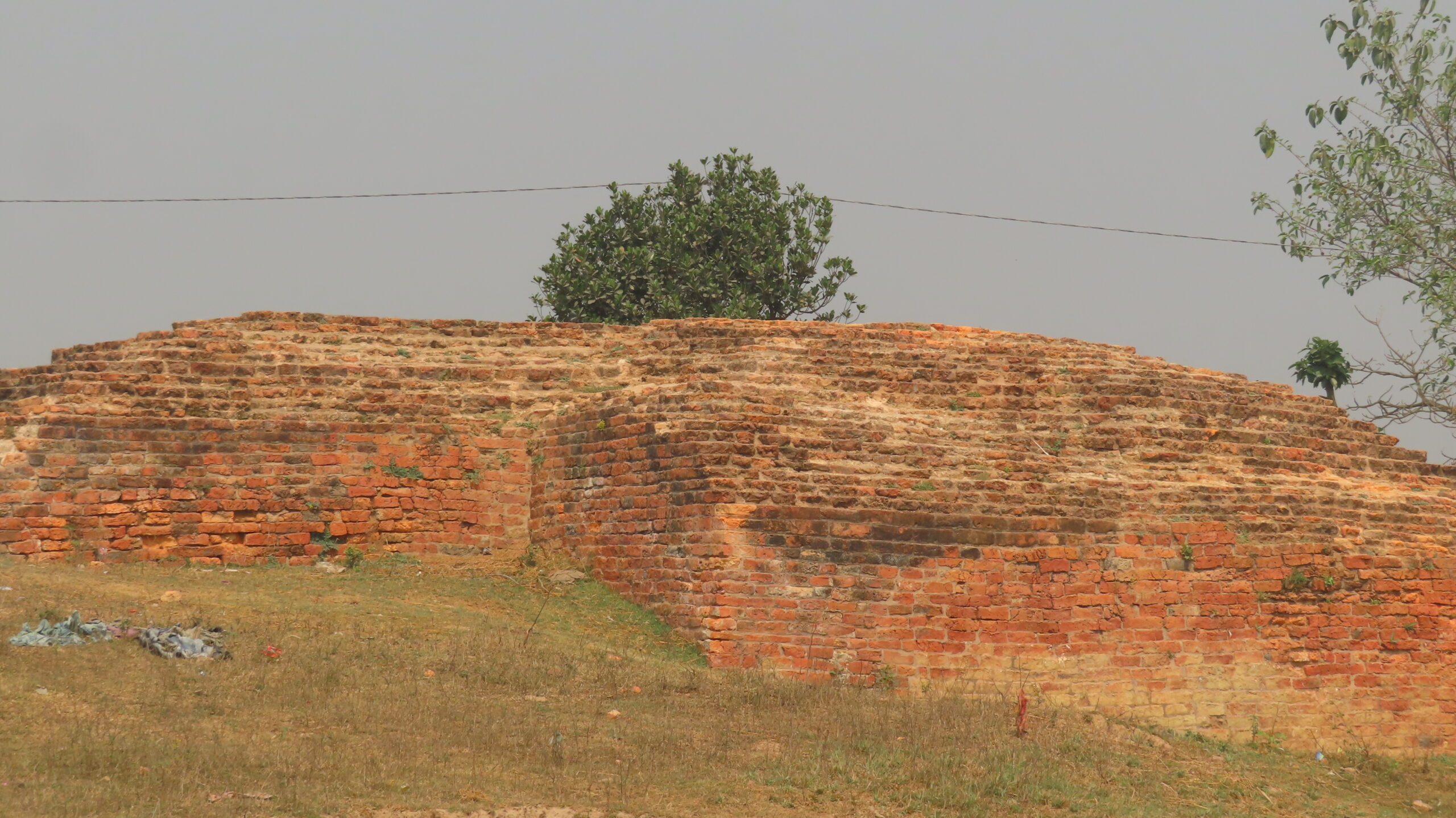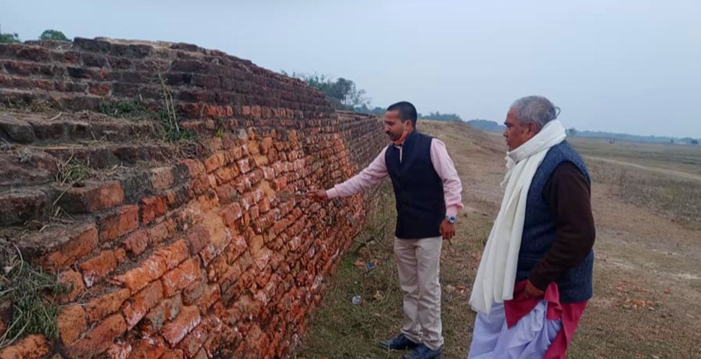 मिश्र जी कहते हैं सर्वप्रथम आर्कियोलॉजिकल सर्वे ऑफ इण्डिया के मध्य-पूर्वी अंचल द्वारा 1962-63 ई. में एक लघुस्तर का उत्खनन कराया गया। ​उसके अनुसार सुरक्षा दीवार मिट्टी की ईटों से निर्मित है तथा ऐसा लगता है कि इसका निर्माण दूसरी शताब्दी ई.पू. में हुआ जिसका उपयोग पालवंश के समय तक हुआ। दीवार का निर्माण एवं मरम्मत कार्य तीन चरणों में हुआ। ऐसा लगता है कि किसी भीषण बाढ़ में दीवार क्षतिग्रस्त हो गया जिसका पुनर्निर्माण कराया गया हो। रिपोर्ट के अनुसार सिक्के, हड्डियों के औजार, मनके, शुंगकालीन मिट्टी से निर्मित मूर्तियों के फलक तथा एक मन्दिर का भग्नावशेष आदि प्राप्त हुए हैं। प्राप्त फलकों में बाएँ सिर कटी हुई महिला तथा दाएँ पुरुष के सिर का फलक है। पुरुष के सिर पर पगड़ी तथा आभूषण दिखाई दे रहे हैं। महिला का चित्र भी आभूषणों से सुसज्जित मालूम होता है।