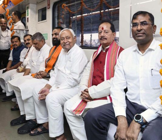 बिहार विधानसभा चुनाव दो चरण (6 और 11 नवम्बर) में, पटना मेट्रो के चमचमाता सीट पर सफ़ेद वस्त्र पर बैठकर यात्रा किये नीतीश कुमार