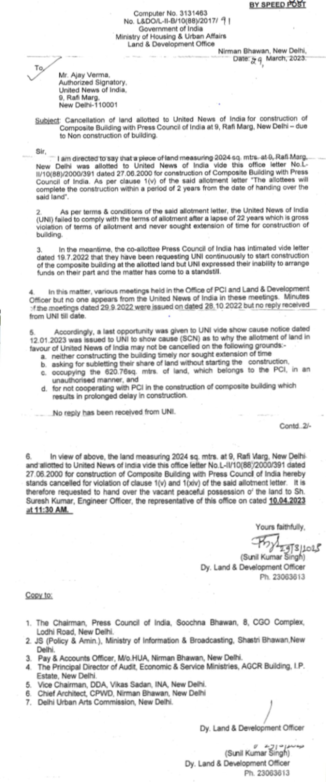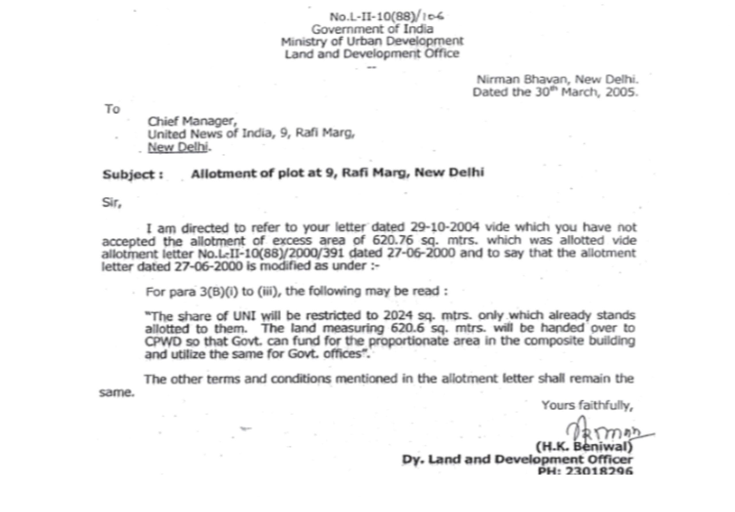 * इसके बाद, L&DO द्वारा 30.03.2005 को यूएनआई को भेजे गए संचार के माध्यम से, 620.76 वर्ग मीटर का वह अतिरिक्त क्षेत्र रद्द कर दिया गया, जो यूएनआई को मूल रूप से आवंटित 2024 वर्ग मीटर भूमि के अतिरिक्त आवंटित किया गया था।
