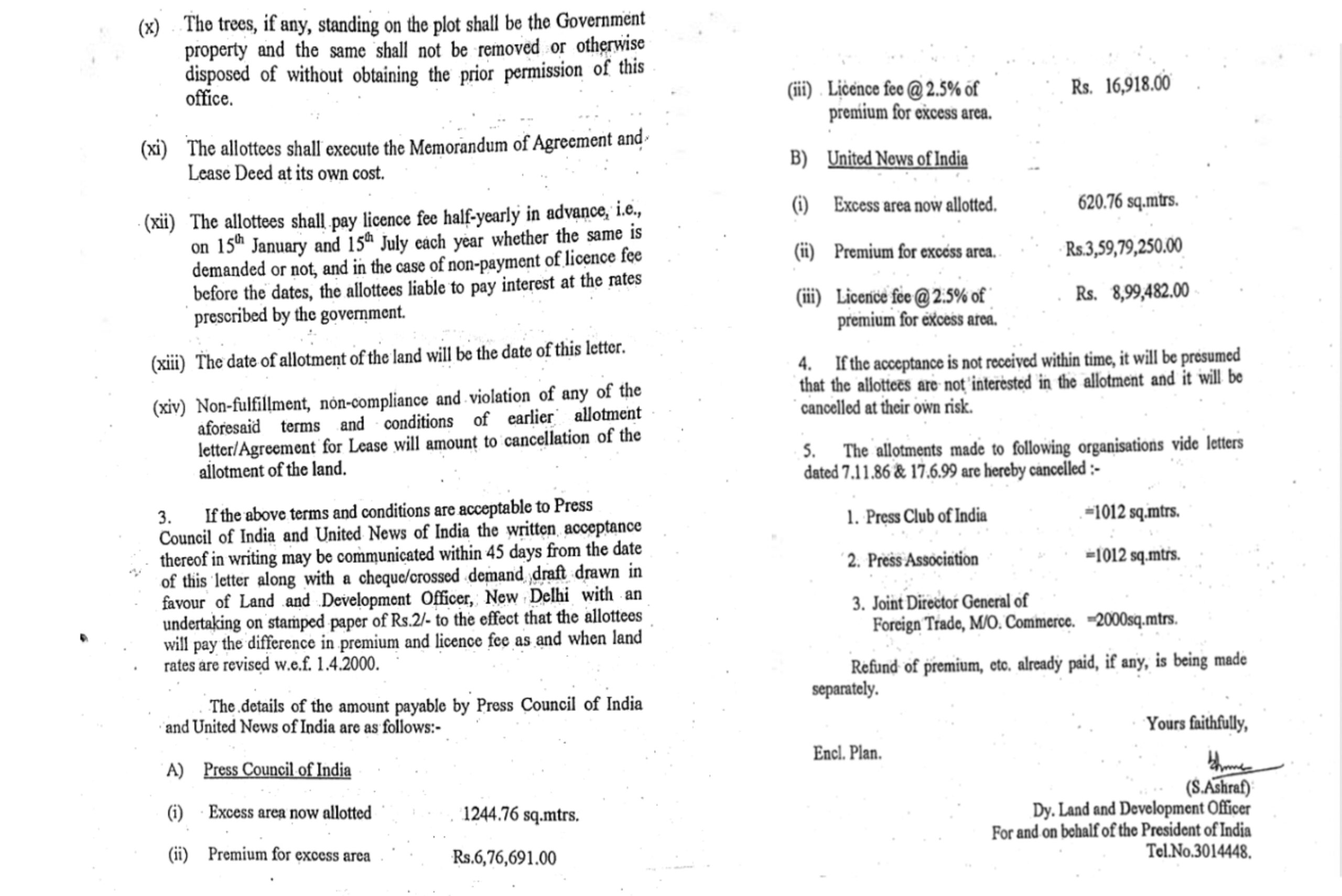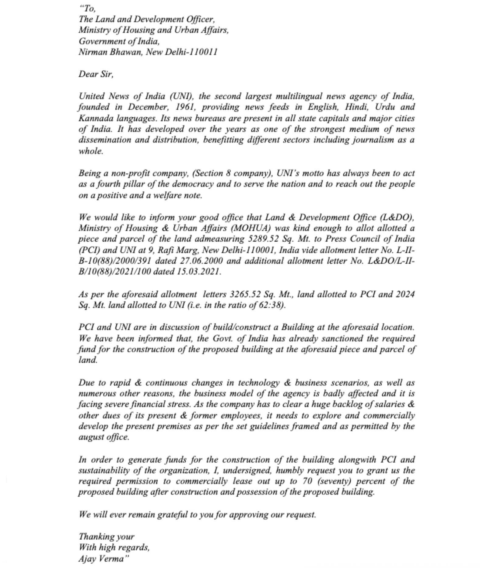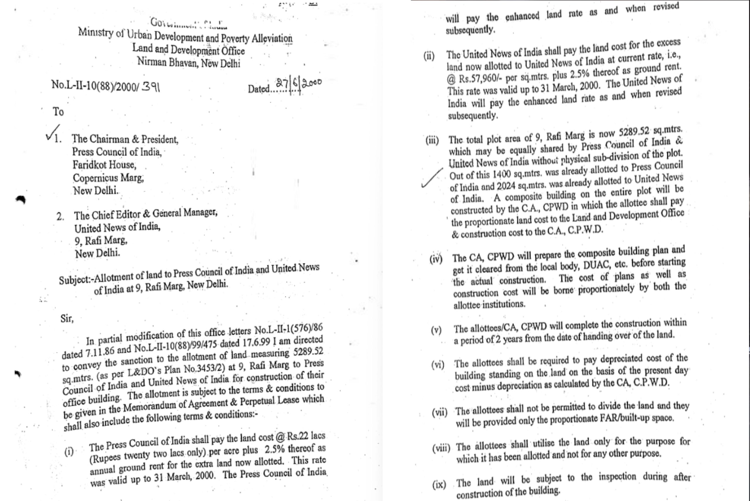 * 27.06.2000 की तारीख वाले पत्र का उद्देश्य प्रेस क्लब ऑफ़ इंडिया, प्रेस एसोसिएशन और वाणिज्य मंत्रालय के विदेश व्यापार के संयुक्त महानिदेशक के पक्ष में पहले किए गए आवंटनों को रद्द करना था। उक्त संचार में आगे प्रेस काउंसिल ऑफ इंडिया को 1244.76 वर्ग मीटर और याचिकाकर्ता को 620.76 वर्ग मीटर अतिरिक्त भूमि आवंटित करने का प्रावधान है; यह आवंटन उस 1400 वर्ग मीटर भूमि के अतिरिक्त है जो पहले ही प्रेस काउंसिल ऑफ इंडिया को आवंटित की जा चुकी थी, और उस 2024 वर्ग मीटर भूमि के अतिरिक्त है जो पहले ही याचिकाकर्ता/यूनाइटेड न्यूज ऑफ इंडिया को आवंटित की जा चुकी थी।