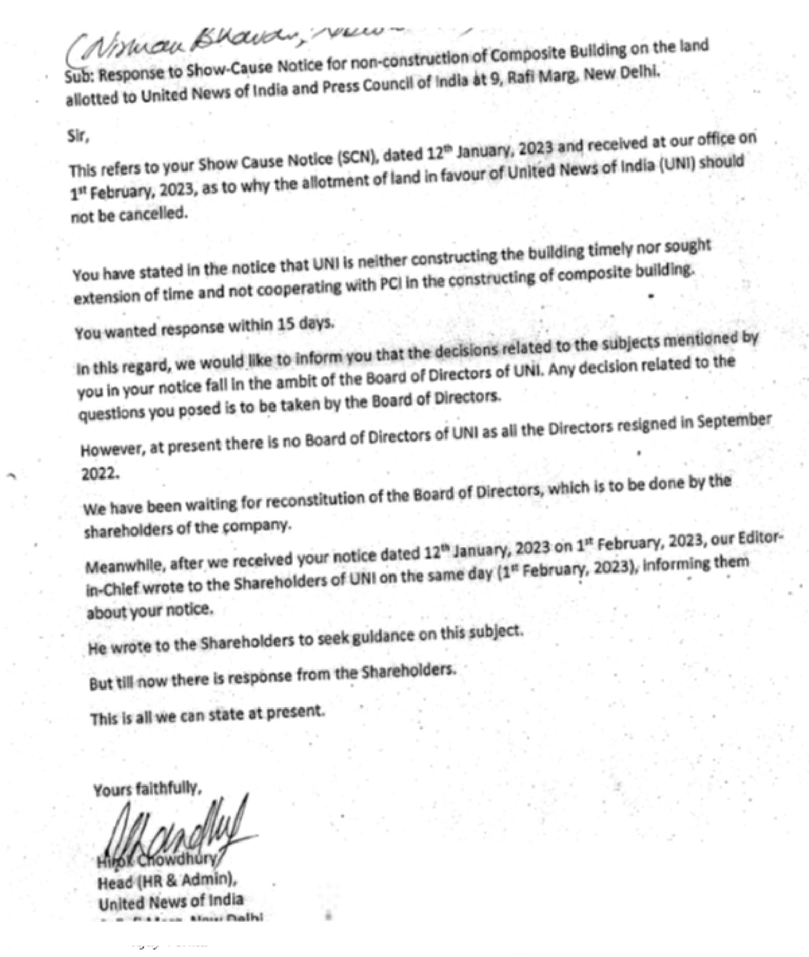 * 14.02.2023 को ‘कारण बताओ नोटिस’ के संबंध में एक अस्पष्ट और मनमाना जवाब प्रस्तुत किया। यूएनआई, अन्य बातों के साथ-साथ, यह कहा कि चूंकि उस समय उसके पास ‘निदेशक मंडल’ नहीं था, इसलिए वह उक्त ‘कारण बताओ नोटिस’ का समुचित जवाब देने में असमर्थ होगा।