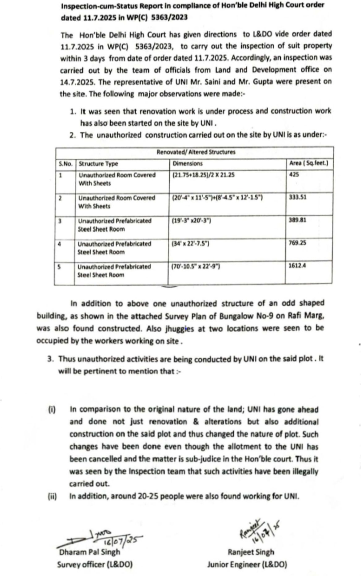 * 14.07.2025 को, उक्त निरीक्षण किया गया और इस संबंध में एक निरीक्षण/स्थिति रिपोर्ट L&DO द्वारा दिनांक 04.08.2025 को दायर की गई, जिसमें यह आरोप लगाया गया था कि यूएनआई द्वारा अनधिकृत निर्माण गतिविधियाँ की जा रही थी, और ऐसी गतिविधियों के परिणामस्वरूप संबंधित भूखंड की प्रकृति में बदलाव आ गया था।