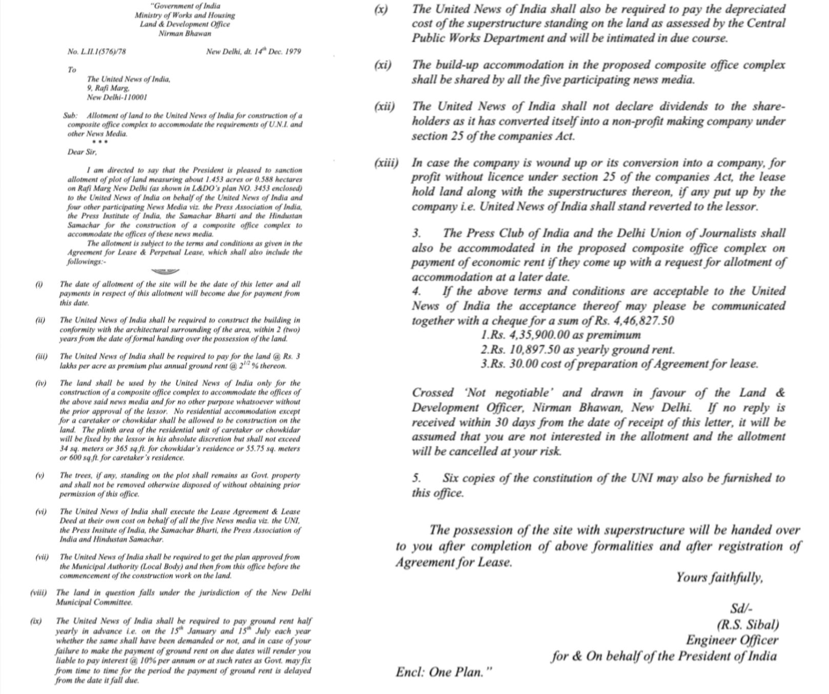 * 07.11.1986 के आवंटन पत्र के खंड (xi) में यह प्रावधान था कि उक्त मीडिया संस्थानों को आपस में एक समझौता करना होगा, जिसमें यह तय किया जाएगा कि प्रस्तावित भवन के निर्माण की लागत किस आधार पर आपस में बांटी जाएगी; साथ ही, इसमें अन्य प्रासंगिक मामलों को भी शामिल किया जाएगा, जिनमें संपत्ति के निर्माण, प्रबंधन और रखरखाव की व्यवस्थाएं शामिल हैं। यह स्वीकार्य है कि 07.11.1986 के आवंटन पत्र के अनुसार जो आवश्यक कदम उठाए जाने थे, वे नहीं उठाए गए; क्योंकि न तो संबंधित आवंटियों के बीच कोई समझौता किया गया और न ही आवश्यक निर्माण कार्य शुरू करने के लिए कोई कदम उठाया गया।