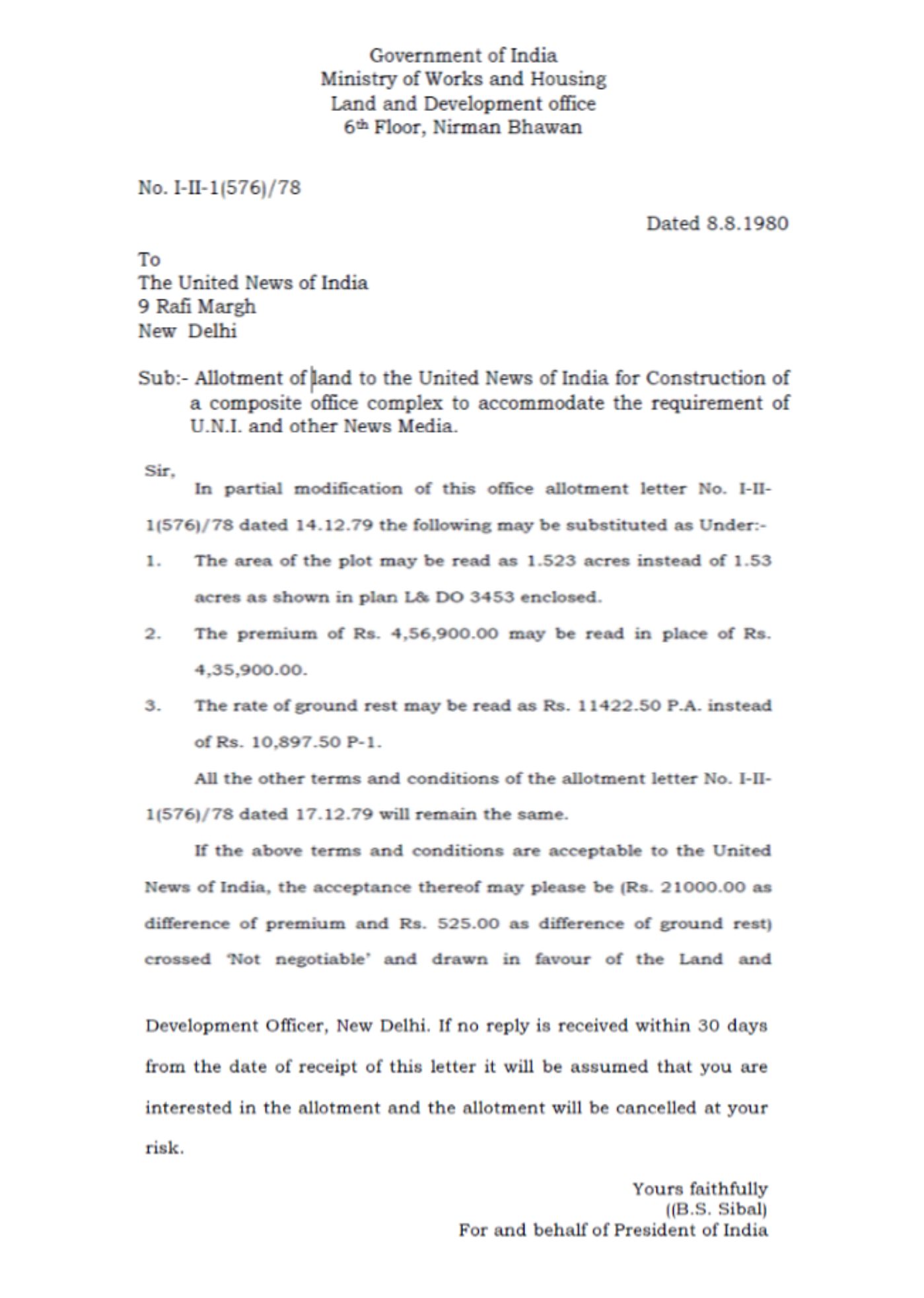 * 08.08.1980 को, दिनांक 14.12.1979 के आवंटन पत्र में संशोधन किया गया, जिसके तहत प्लॉट के क्षेत्रफल के साथ-साथ उससे संबंधित देय प्रीमियम और ज़मीनी किराए के संबंध में कुछ छोटे-मोटे बदलाव किए गए।