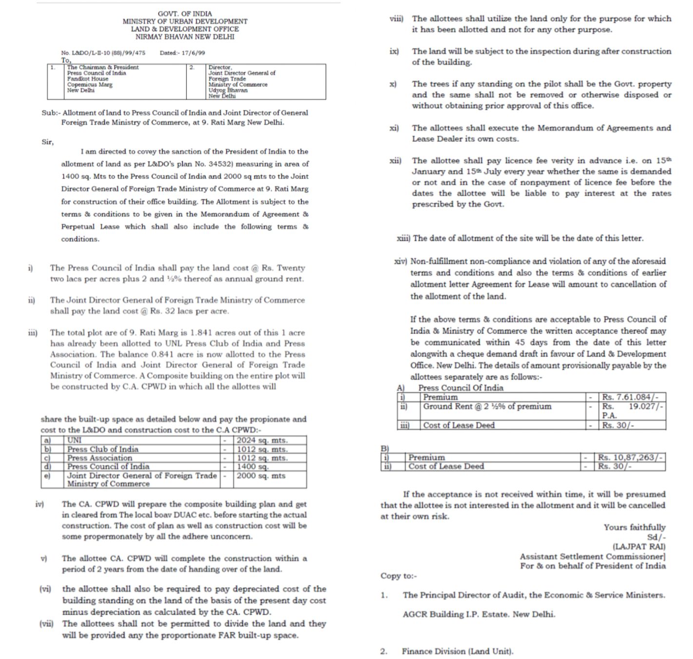 * 17.06.1999 को, 9, रफी मार्ग, नई दिल्ली में स्थित ज़मीन के संबंध में एक और आवंटन पत्र जारी किया गया। उक्त पत्र में यह दर्ज है कि प्लॉट का कुल क्षेत्रफल 1.841 एकड़ था, जिसमें से 1 एकड़ जमीन पहले ही यूनाइटेड न्यूज ऑफ इंडिया, प्रेस क्लब ऑफ़ इंडिया और प्रेस एसोसिएशन को संयुक्त रूप से आवंटित की जा चुकी थी। इस पत्र में आगे शेष 0.841 एकड़ जमीन प्रेस काउंसिल ऑफ इंडिया और विदेश व्यापार संयुक्त महानिदेशक, वाणिज्य मंत्रालय को आवंटित करने का प्रस्ताव था। इसमें आगे यह भी परिकल्पना की गई थी कि पूरे प्लॉट पर एक मिश्रित भवन का निर्माण केंद्रीय लोक निर्माण विभाग द्वारा किया जाएगा, जिसमें विभिन्न आवंटिती उक्त आवंटन पत्र में निर्दिष्ट अनुपात में निर्मित स्थान को साझा करने के हकदार होंगे।