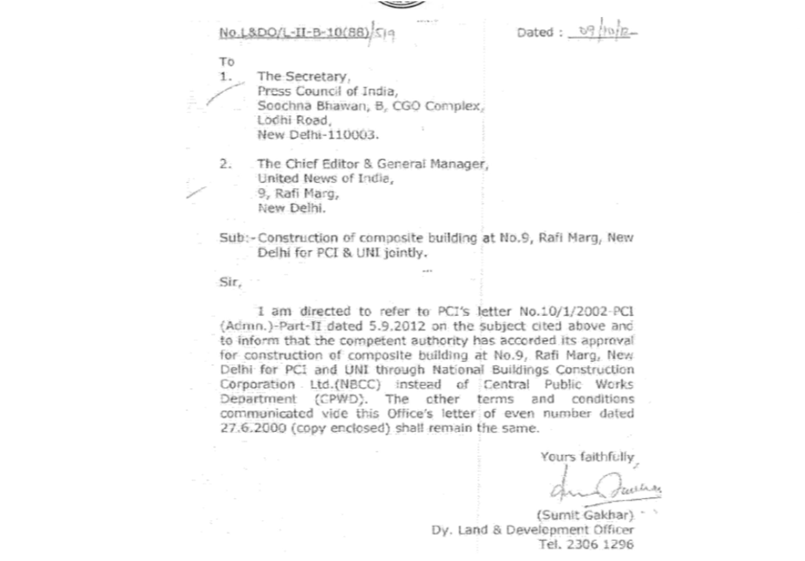 * 09.10.2012 के पत्र के माध्यम से यह सूचित किया गया था कि सक्षम प्राधिकारी ने 9, रफी मार्ग, नई दिल्ली में प्रेस काउंसिल ऑफ इंडिया और यूनाइटेड न्यूज़ ऑफ इंडिया के लिए एक मिश्रित भवन के निर्माण हेतु नेशनल बिल्डिंग्स कंस्ट्रक्शन कॉर्पोरेशन लिमिटेड के माध्यम से स्वीकृति प्रदान कर दी है; यह स्वीकृति सेंट्रल पब्लिक वर्क्स डिपार्टमेंट के स्थान पर दी गई है, जिसे पहले निष्पादन एजेंसी के रूप में परिकल्पित किया गया था।
