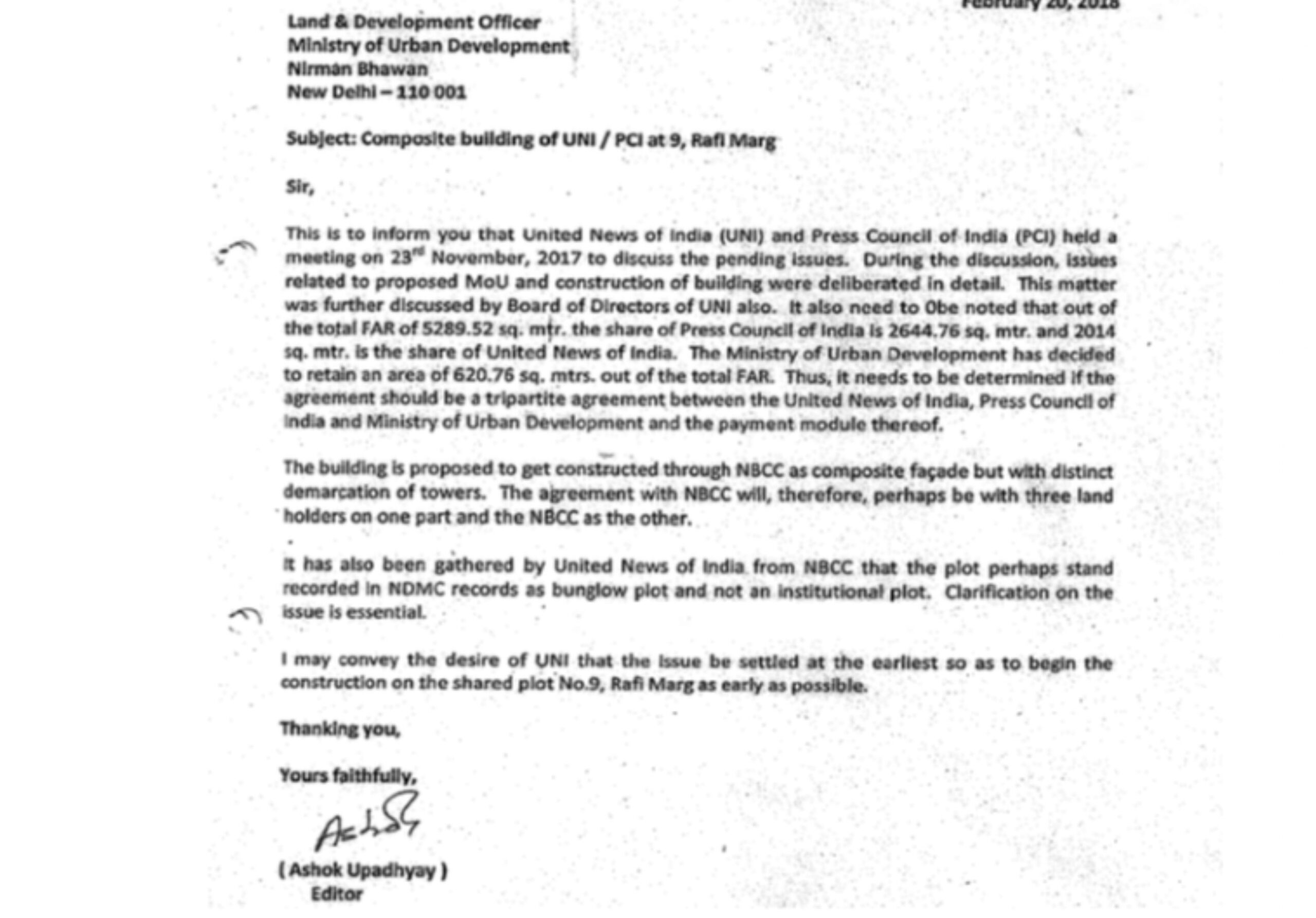 * 20.02.2018 को, यूएनआई ने भूमि और विकास कार्यालय (L&DO) को एक पत्र भेजा, जिसमें यह स्पष्टीकरण मांगा गया था कि क्या याचिकाकर्ता, भारतीय प्रेस परिषद और शहरी विकास मंत्रालय के बीच एक त्रिपक्षीय समझौता किया जाना चाहिए, इस तथ्य को देखते हुए कि तब तक लगभग 620 वर्ग मीटर का अतिरिक्त क्षेत्र केंद्रीय लोक निर्माण विभाग /सरकारी उपयोग के लिए निर्धारित किया जा चुका था।