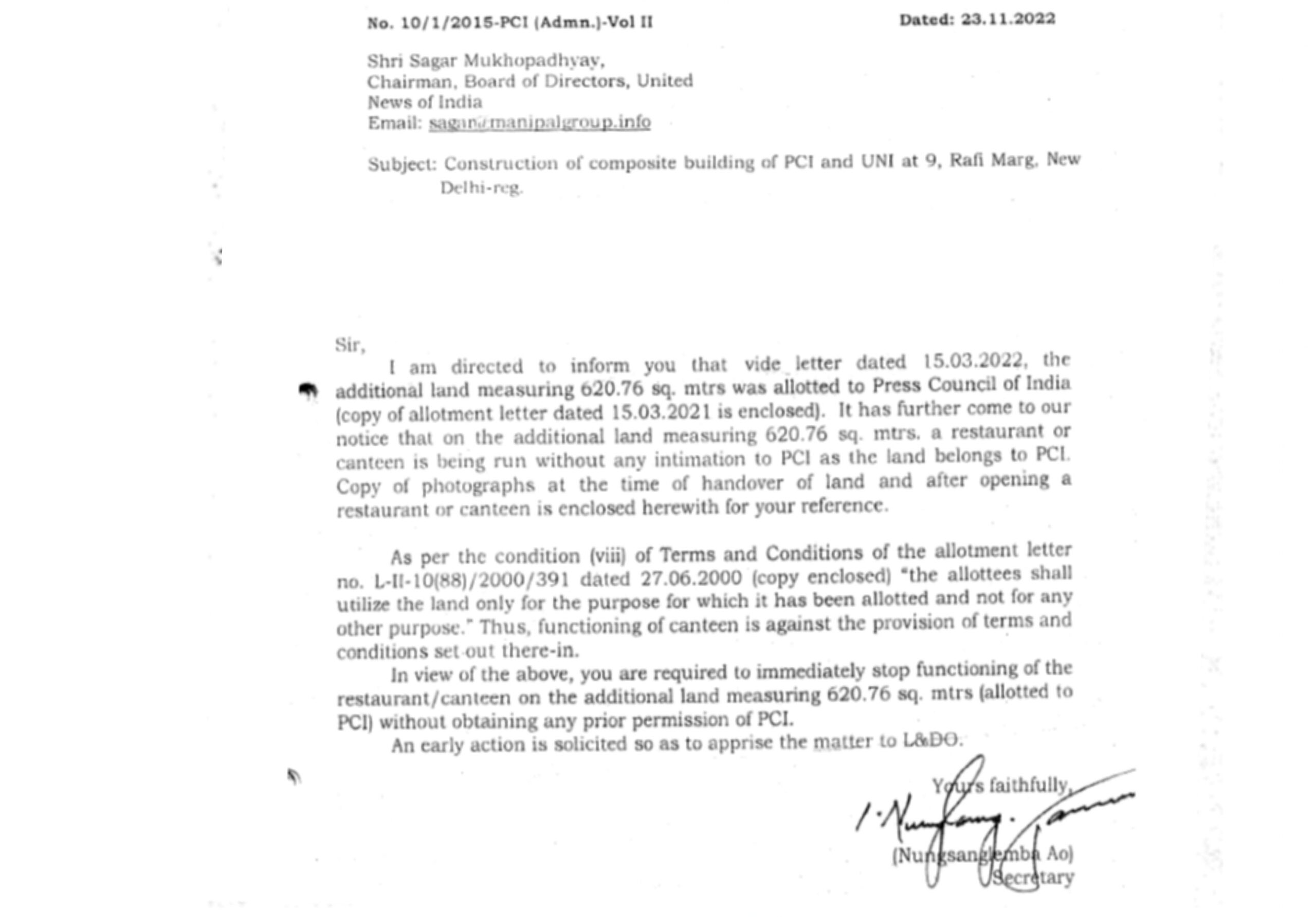* 26. 23.11.2022 के एक पत्र के माध्यम से, प्रेस काउंसिल ऑफ इंडिया ने एक आपत्ति उठाई, जिसमें कहा गया था कि यूएनआई ने कथित तौर पर 620 वर्ग मीटर भूमि के उस हिस्से पर एक रेस्तरां/कैंटीन चलाना शुरू कर दिया है, जो प्रेस काउंसिल ऑफ इंडिया को आवंटित किया गया था; और यह कार्य उसने बिना किसी पूर्व सूचना के तथा आवंटन को नियंत्रित करने वाले नियमों और शर्तों का उल्लंघन करते हुए किया है।