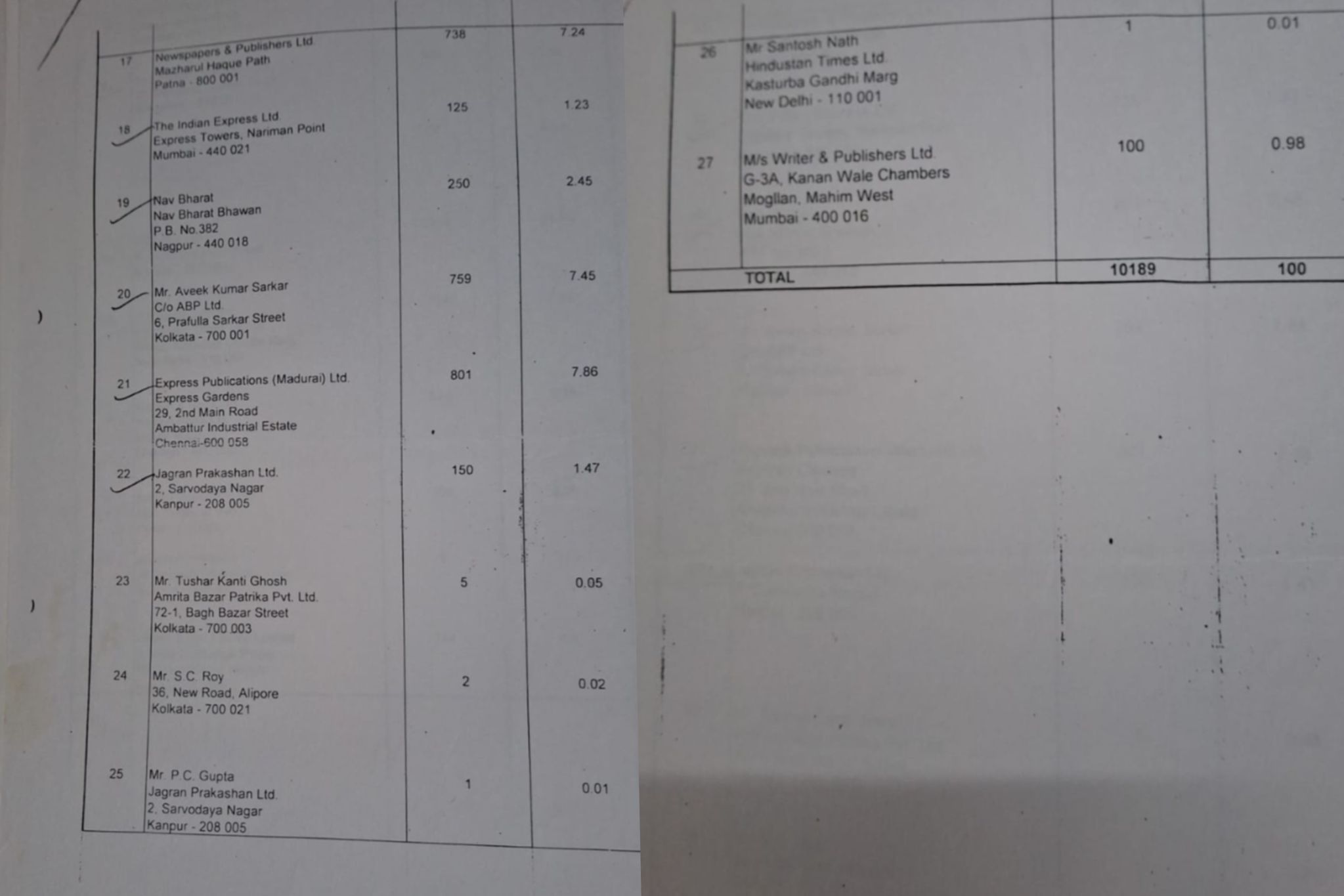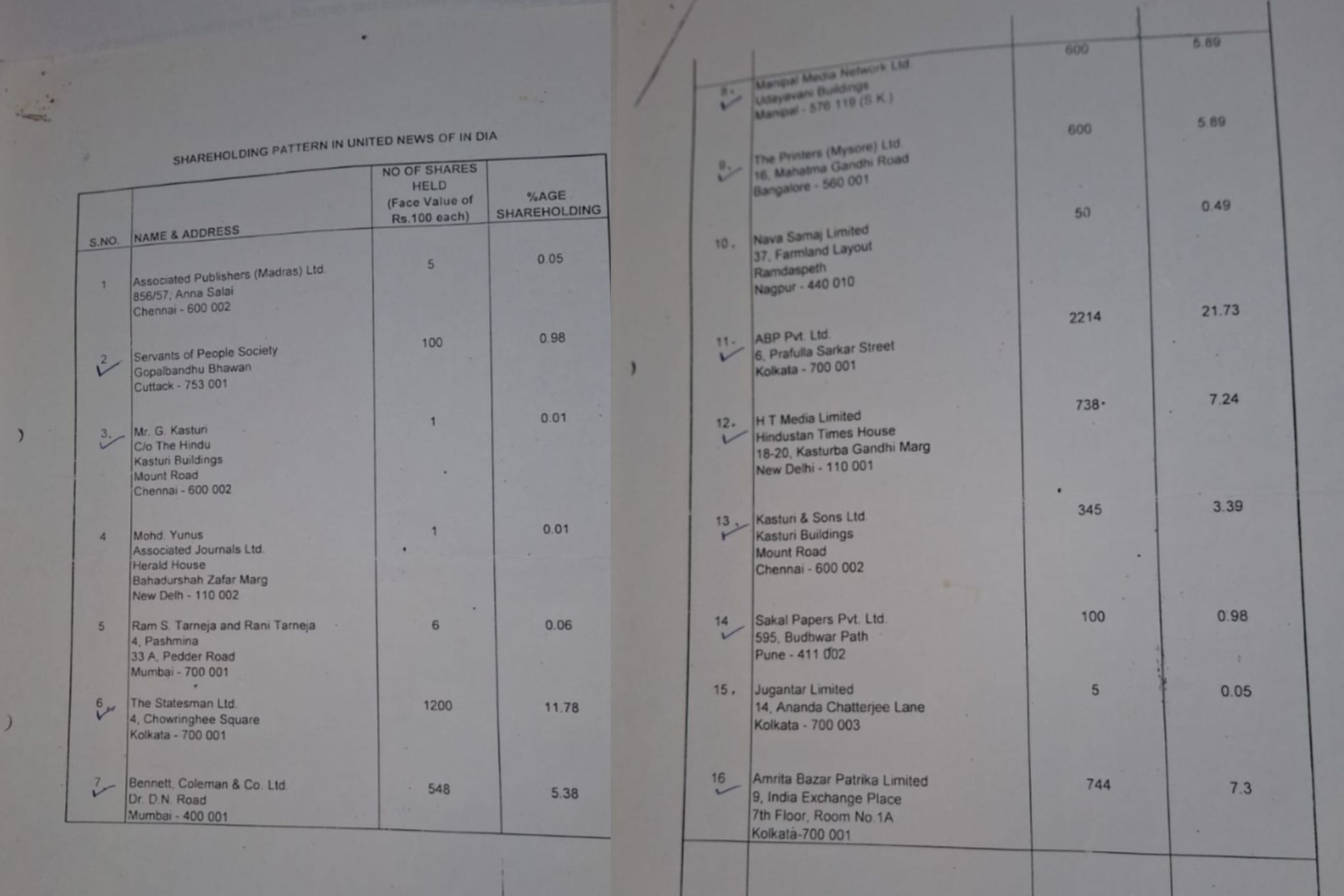 अमृत बाजार पत्रिका, 9-इंडिया एक्सचेंज प्लेस, 7 वां तल्ला, रूम नंबर-1A, कलकत्ता-700001 का 744 शेयर (7.3 %) और तुषार कांति घोष का 5 शेयर (0.05 %) है। बेनेट कोलेमन एंड कंपनी लिमिटेड का 548 शेयर (5.38 %) है, मणिपाल मीडिया नेटवर्क लिमिटेड का 600 शेयर (5.89%), दी प्रिंटर (मैसूर) लिमिटेड का 600 (5.89 %), नवा समाज लिमिटेड का 50 शेयर (0.49%), एच.टी. मीडिया लिमिटेड का 738 शेयर (7.24%) संतोषनाथ, हिंदुस्तान टाइम्स लिमिटेड का 1 शेयर (0.01%), कस्तूरी एंड साँस लिमिटेड, कस्तूरी बिल्डिंग, माउन्ट रोड, चेन्नई का 345 शेयर (3.39%), सकल पेपर्स प्राइवेट लिमिटेड, पुणे का 100 शेयर (0.98%), जुगांतर लिमिटेड का 5 शेयर (0.05%), न्यूजपेपर्स एंड पब्लिकेशंस लिमिटेड, माझारूलहक पथ, पटना का 736 शेयर (7.24%), नव भारत, नागपुर का 250 शेयर (2.45 %) , जागरण प्रकाशन लिमिटेड का 150 शेयर (1.47%) के साथ पीसी गुप्ता, जागरण प्रकाशन लिमिटेड का 1 शेयर (0.01%), एससी रॉय, 36-न्यू रोड, अलीपुर, कोलकाता का 2 शेयर (0.02%), राइटर्स एंड पब्लिशर्स लिमिटेड, जी-3A, काननवाले चैम्बर्स, माहिम वेस्ट, मुंबई का 100 शेयर (0.98%), एसोसिएटेड पब्लिशर्स (मद्रास) लिमिटेड का 5 शेयर (0.05%), सर्वेंट्स ऑफ़ पीपुल्स सोसाइटी, गोपालबंधु भवन, कटक का 100 शेयर (0.98%), राम एस तरनेजा और रानी तरनेजा, 4-पश्मीना, 33 A, पेडर रोड, मुंबई का 6 शेयर (0.06%), मोहम्मद यूनुस असोसिएटेड जर्नल्स लिमिटेड, हेराल्ड हॉउस, बहादुरशाह ज़फर मार्ग,नई दिल्ली का 1 शेयर (0.01%), और जी कस्तूरी का 1 शेयर (0.01%) है।